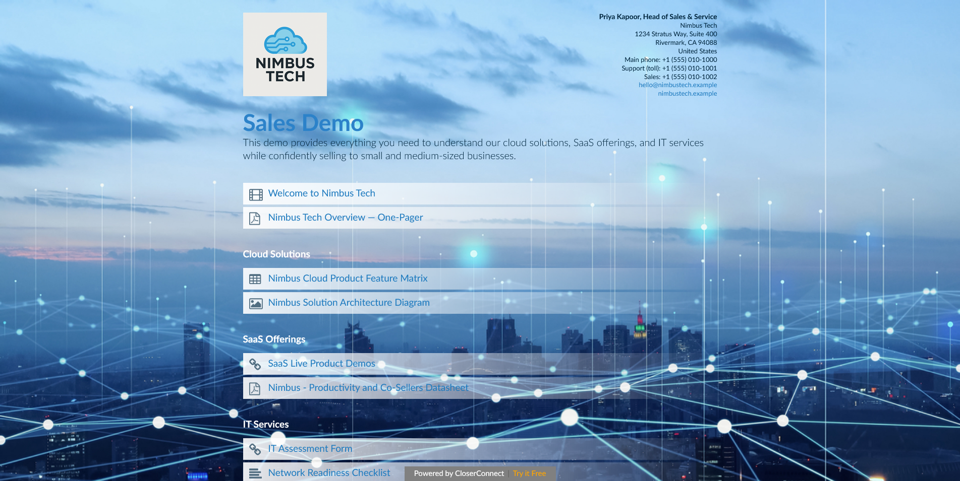 Share or assign any combo of digital content (videos, docs, PDF’s, SCORM elearning, etc.) on a page that reflects your brand, delivered with just one URL, securely personalized for your client, and tracking for sales demos or online training.